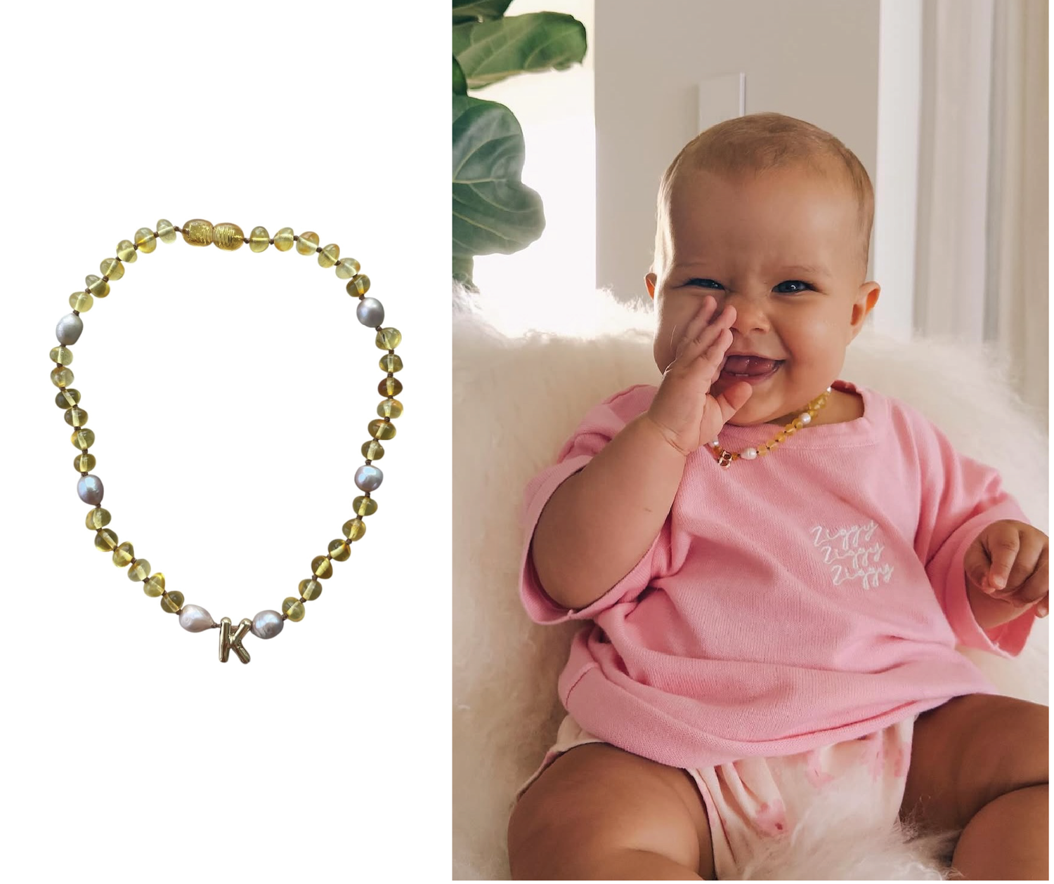 Baby Initial Necklace - Baltic Amber Lemon + Pearls